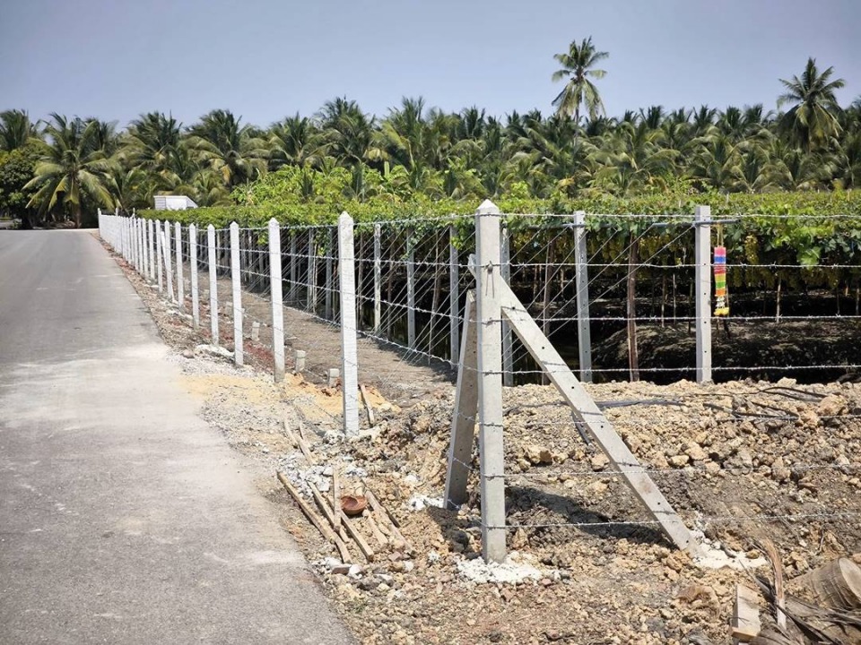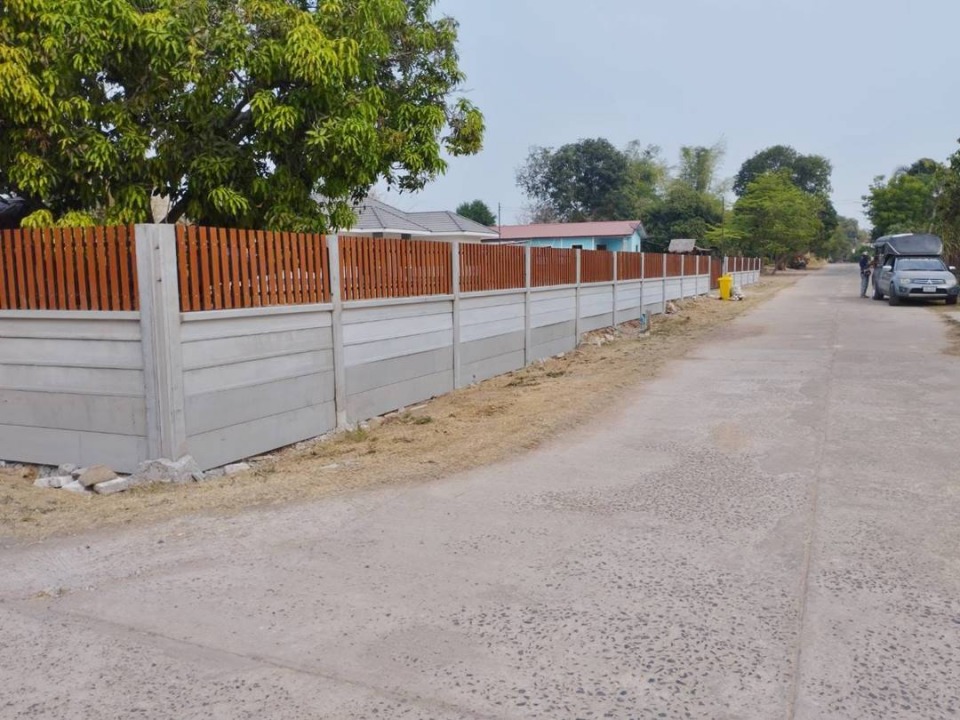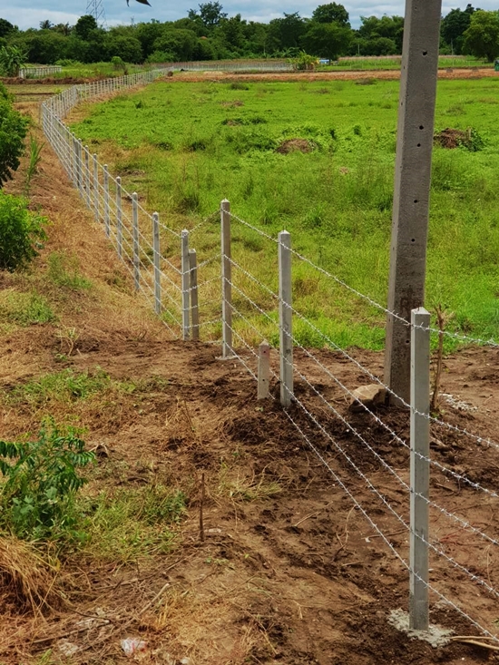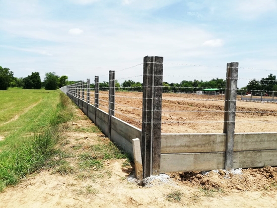 • ใช้เสาปูนมาตรฐาน เสาลวดหนามขนาดหน้าตัด 3นิ้ว x 3นิ้ว x ยาว 2.50 เมตร ขุดหลุมตั้งเสาเทปูนให้ทุกต้นพร้อมค้ำยันกันเสาล้มทุก 10 ต้นและเสาค้ำยันทุกมุมที่ดิน ฝังโคนเสาลงดิน 50 ซม.